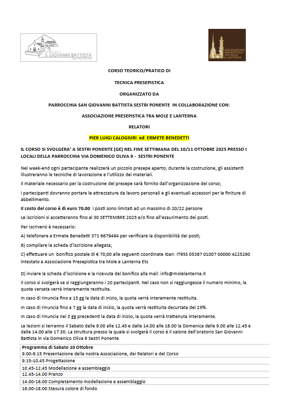 Nel week-end ogni partecipante realizzerà un piccolo presepe aperto; durante la costruzione, gli assistenti illustreranno le tecniche di lavorazione e l’utilizzo dei materiali. Il materiale necessario per la costruzione del presepe sarà fornito dall’organizzazione del corso;